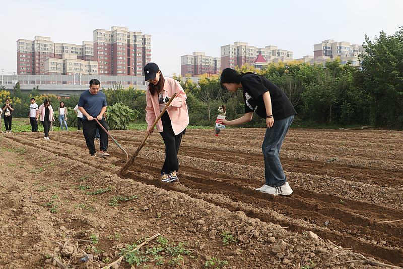 成熟的向日葵低下了沉甸甸的花盤,園區工作人員手持鐮刀向團員青年員工們示范了采摘向日葵的方法技巧,大家挽袖上陣,挑選著自己心儀的果實,持鐮砍收。隨后,在農業技術人員的帶領下,大家來到了蔬菜種植區播種油菜,男生們松土犁地,將基土整理成一道道規整的形態;女生們順壟而行,將一粒粒油菜籽均勻地播撒其中。農耕雖累,但勞有所獲,讓大家樂在其中、喜笑顏開。
