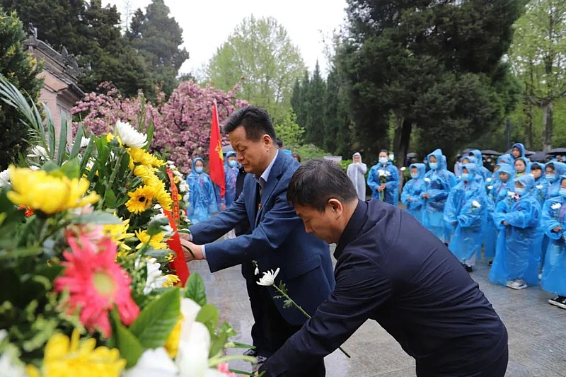 在革命烈士紀念碑前,團員、少先隊員代表手抬花籃緩步走向革命烈士紀念碑,向革命先烈敬獻花籃,投資公司和學校黨員代表整理挽聯。在一座座英雄墓碑前,全體人員向英雄烈士鞠躬默哀,并將胸前的小白花獻給英烈,表達對先烈的哀思和敬仰。