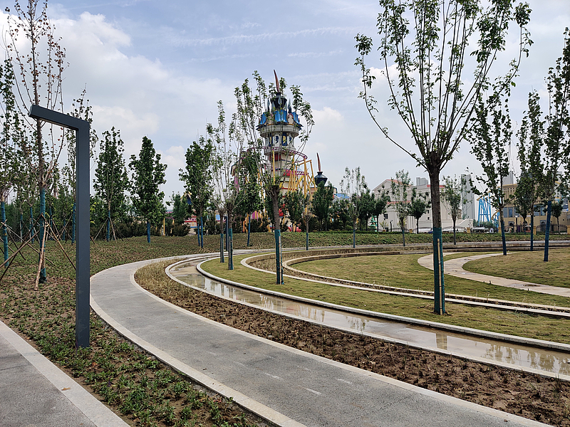 興科路東側林帶。項目位于灃西新城核心區地鐵五號線沿線、絲路歡樂世界以西,面積約7.1萬平方米。作為絲路歡樂世界外圍展示窗口,項目景觀風格融合絲路文化氛圍,設計多樣化服務功能,依托臨街界面打造藝術亮點,形成綠色生態、開放共享的林蔭街景,不僅為游樂場地打造了特色入口景觀,更為周邊群眾提供了多功能綠色休閑空間。