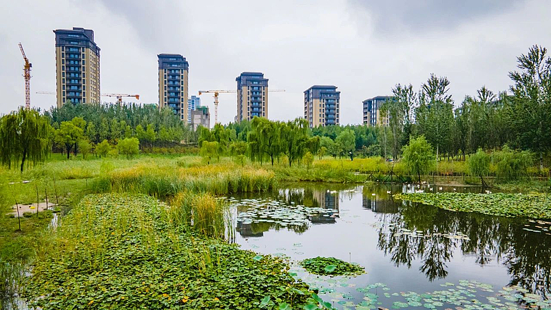 在海綿城市建設(shè)中,灃西新城創(chuàng)新提出了“建筑地塊確保雨水應(yīng)收盡收、市政道路加強集水功能、景觀綠地優(yōu)化豎向設(shè)計、中央雨洪系統(tǒng)形成調(diào)蓄樞紐、河道修復(fù)增加天然水域”等做法,對雨水進行“滲、滯、蓄、凈、用、排”多種方式處理。