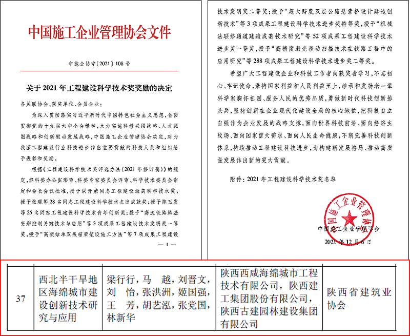 近日,灃西集團海綿城市技術公司與陜西建工集團股份有限公司、陜西古建園林建設集團有限公司等共同申報的項目“西北半干旱地區海綿城市建設創新技術研究與應用”榮獲中國施工企業管理協會2021年工程建設科學技術進步獎二等獎。
