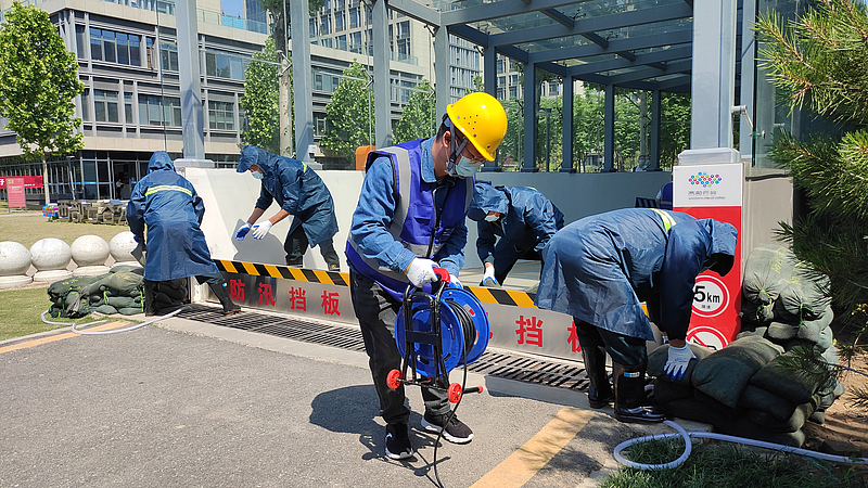 本次活動為灃西新城防汛救援演練的第三點位,現場模擬因較大雨情導致雨水倒灌云谷園區地下車庫后的應急救援場景。整個演練過程緊張有序、組織嚴密、分工明確,參加演練人員快速響應、對相關防汛器材操作熟練,展現了有序、高效、安全的防汛戰斗力。