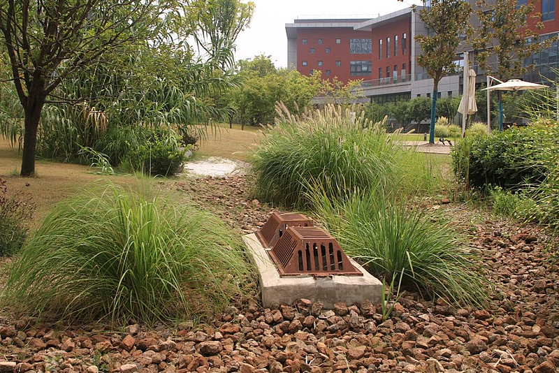 北方夏季雨水集中,如何避免城市短時積水問題?為此,魯偉根據儲排結合原則自創了一種低于路面的“雨水花園”。雨水花園相當于一個蓄水池,中間低兩邊高,城市雨水聚集在花園中形成一個天然的蓄水池。花園中的植物分散種植,建筑廢料則分散堆積在植物周圍,與土壤接觸的區域是中空的,水流可以滲到地下,防止地表出現積水。若雨水達到一定極限,則通過地下溝渠或過濾透水層分流入景區人造湖泊或河流,從而杜絕雨水溢滿現象。